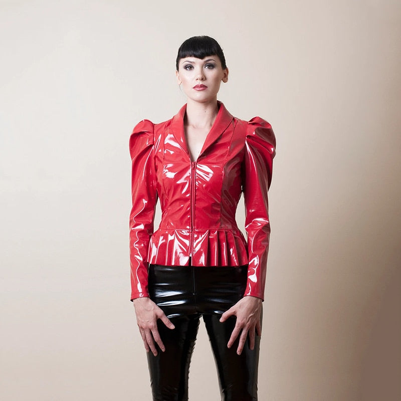 This gothic-style jacket is adorned with ruffles and zippers, providing a trendy and edgy look. It is available in three classic colors: Black, Red, and Rose red.